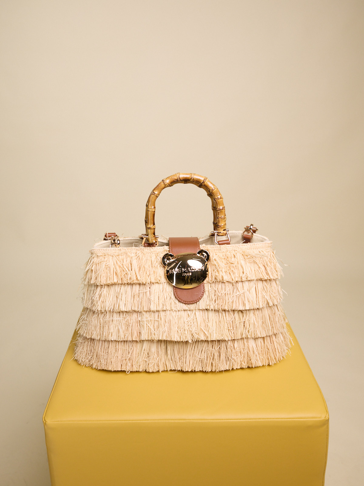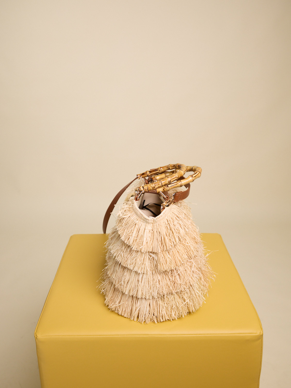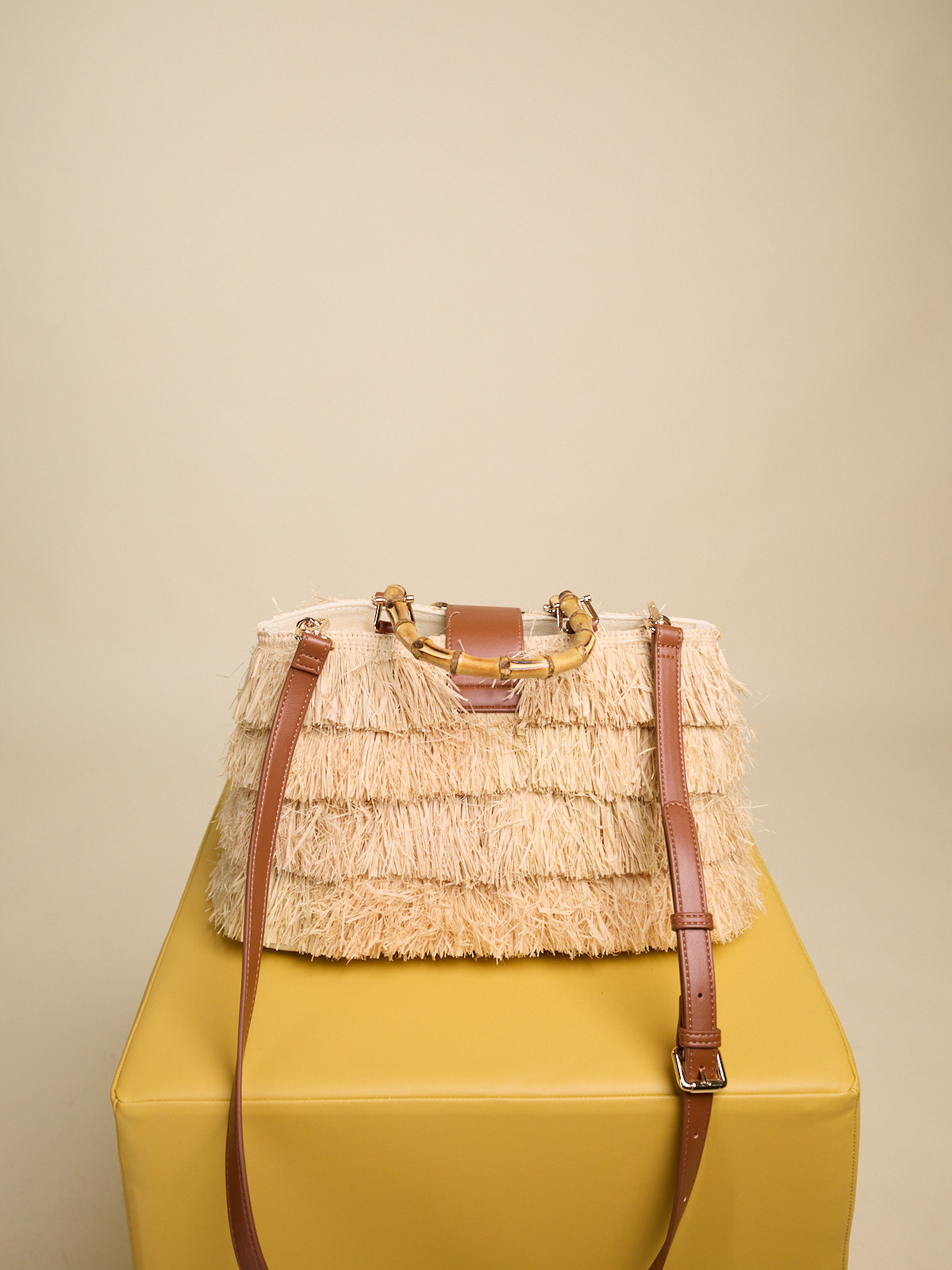 BORSA IN RAFFIA CON FRANGE NATURALI E MANICI IN BAMBOO CON TRACOLLA RIMOVIBILE Dimensioni L 36 x H 21 x P 16 cm