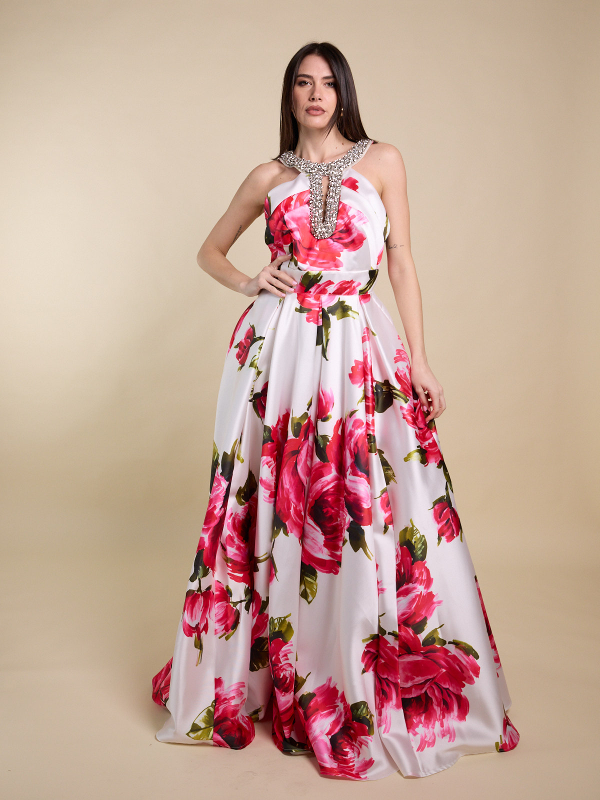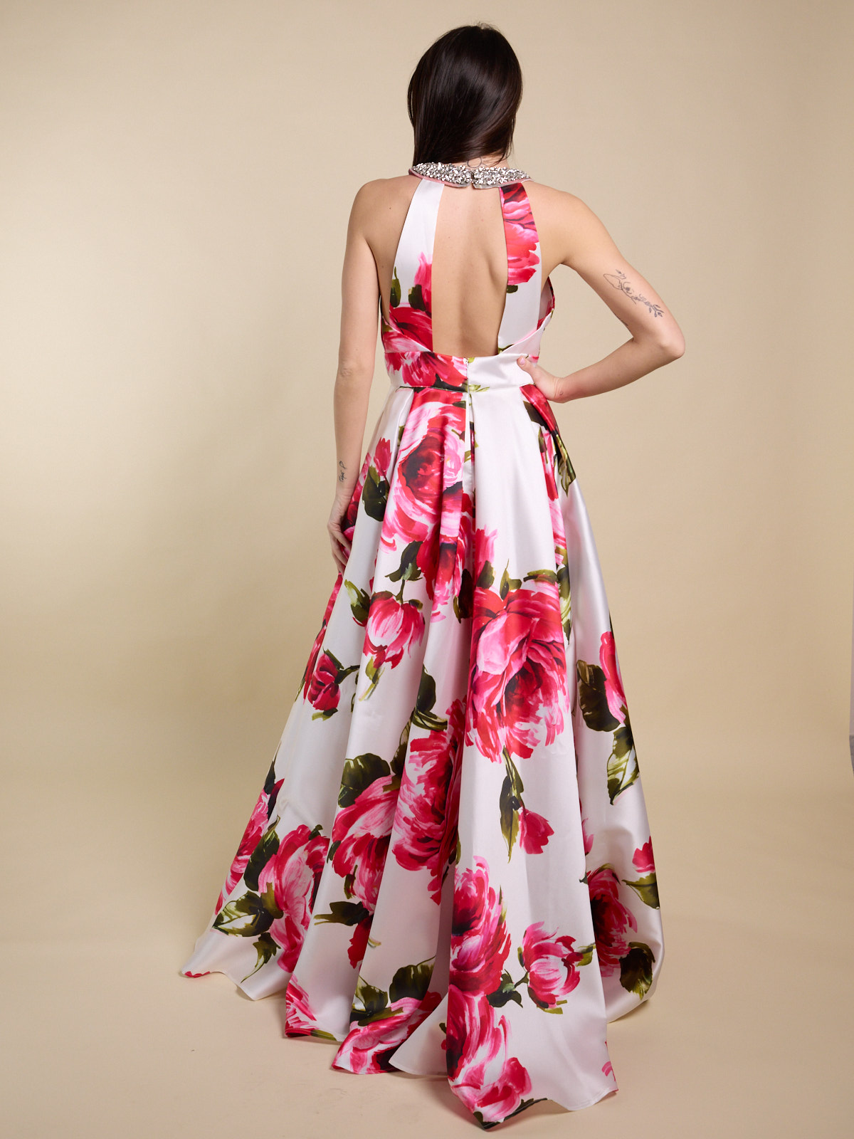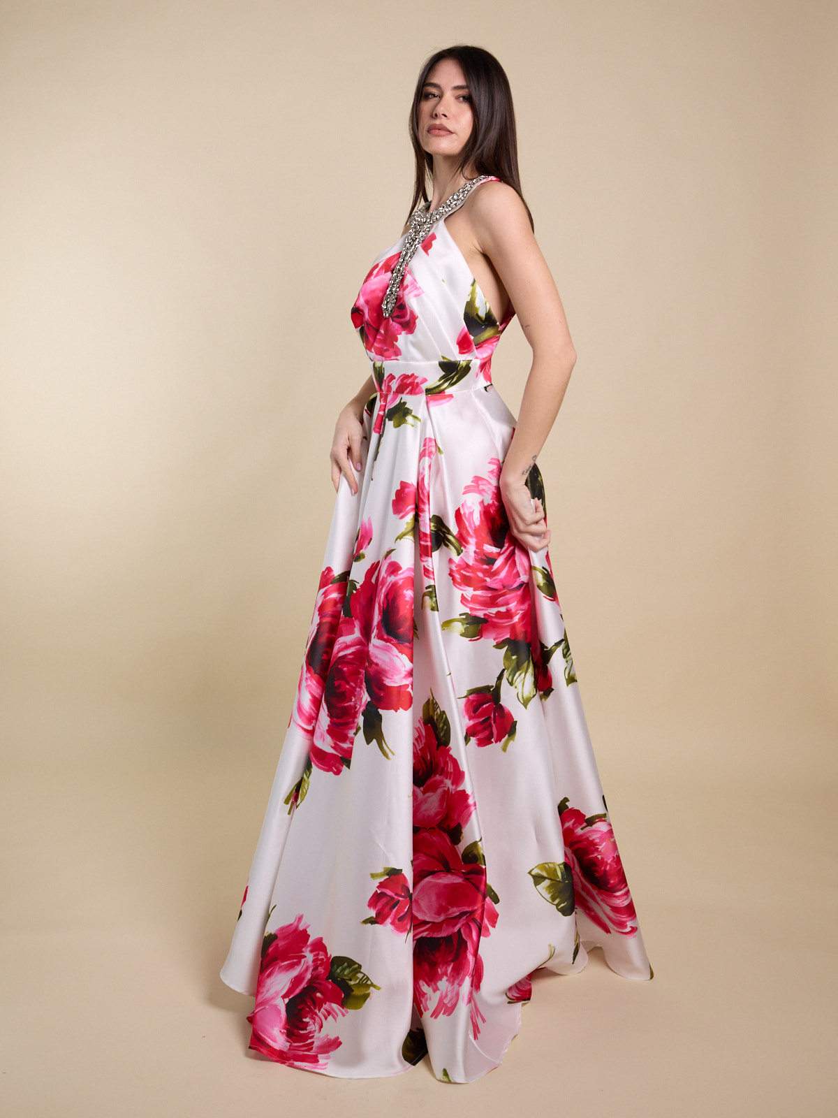 ABITO LUNGO SCOLLO AMERICA IN TAFFETA STAMPA FLOREALE CON STRASS SU SCOLLO E GONNA AMPIA CON PIEGHE
